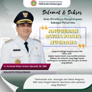 H. Achmad Afzan Arslan Djunaid, SE, MM., Walikota Pekalongan, menerima Apresiasi Anugerah Tertinggi Pengurus Besar PGRI Tahun 2025 dengan kategori Anugerah Dwija Praja Nugraha. Penghargaan ini merupakan bentuk pengakuan atas komitmen dan keberpihakan beliau terhadap kemajuan pendidikan, kesejahteraan guru, serta penguatan peran PGRI sebagai mitra strategis pemerintah daerah.